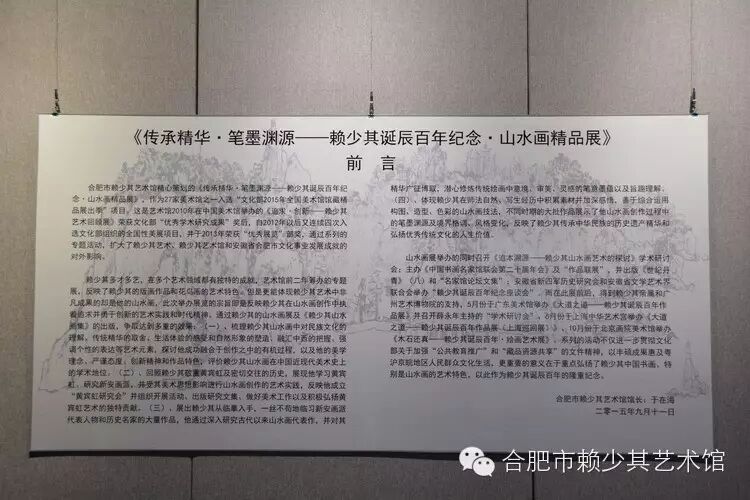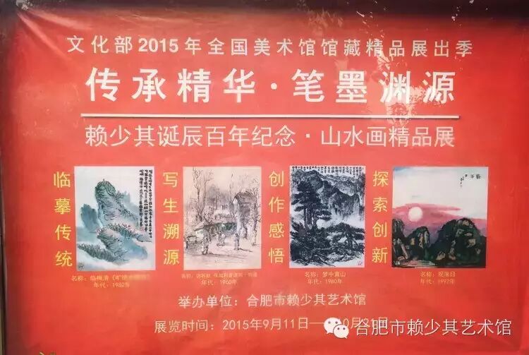 合肥市赖少其艺术馆精心策划的《传承精华·笔墨渊源——赖少其诞辰百年纪念·山水画精品展》,于2015年9月11日至10月31日展出。此展作为27家美术馆之一入选“文化部2015年全国美术馆馆藏精品展出季”项目,这是艺术馆自2012年以来连续四次入选文化部组织的全国性美展项目,并于2013年荣获“优秀展览”部奖,通过系列的专题活动,扩大了赖少其艺术、赖少其艺术馆和安徽省合肥市文化事业发展成就的对外影响。